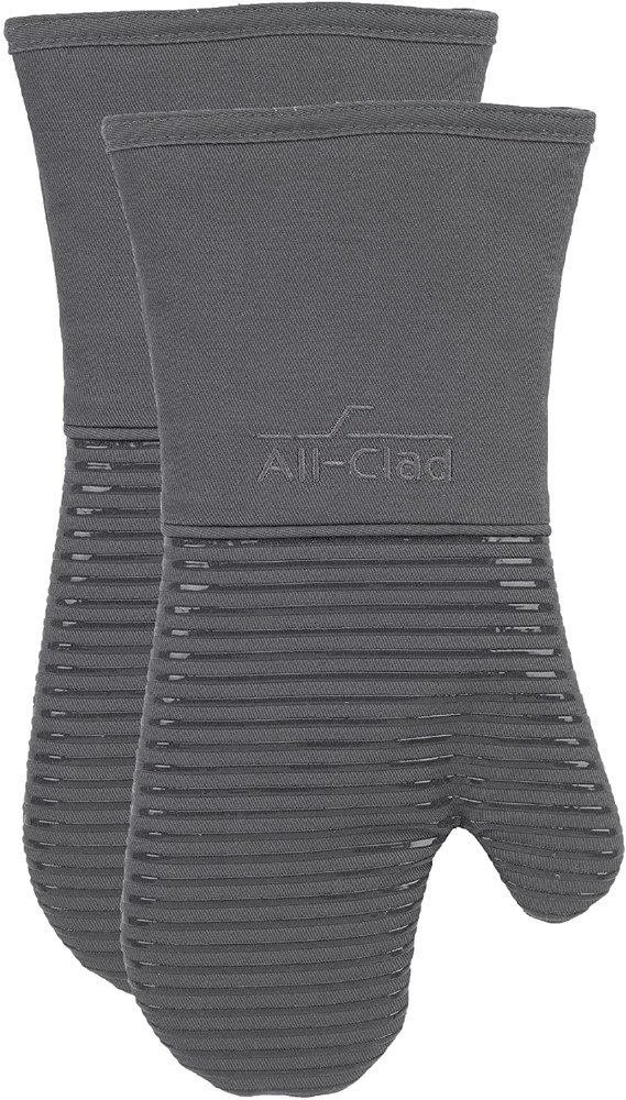When it comes to choosing an oven mitt the most important thing is protecting yourself from burns and no oven mitt does it better than the Black Silicone Oven Mitt from All-Clad. Made from 100% cotton twill and coated in silicone on both sides, this oven mitt has superior heat resistance and additional protection around the thumb to prevent burns. This construction also extends the life of the oven mitt, allowing for it to withstand high oven temperatures and resist stains for much longer than regular oven mitts. Designed to protect more than your hands, this oven mitt is 14" long and features a no-slip grip to avoid spills. Don't risk your family's hands with any other oven mitt, get the All-Clad Silicone Oven Mitt today and get superior protection from burns for years to come.