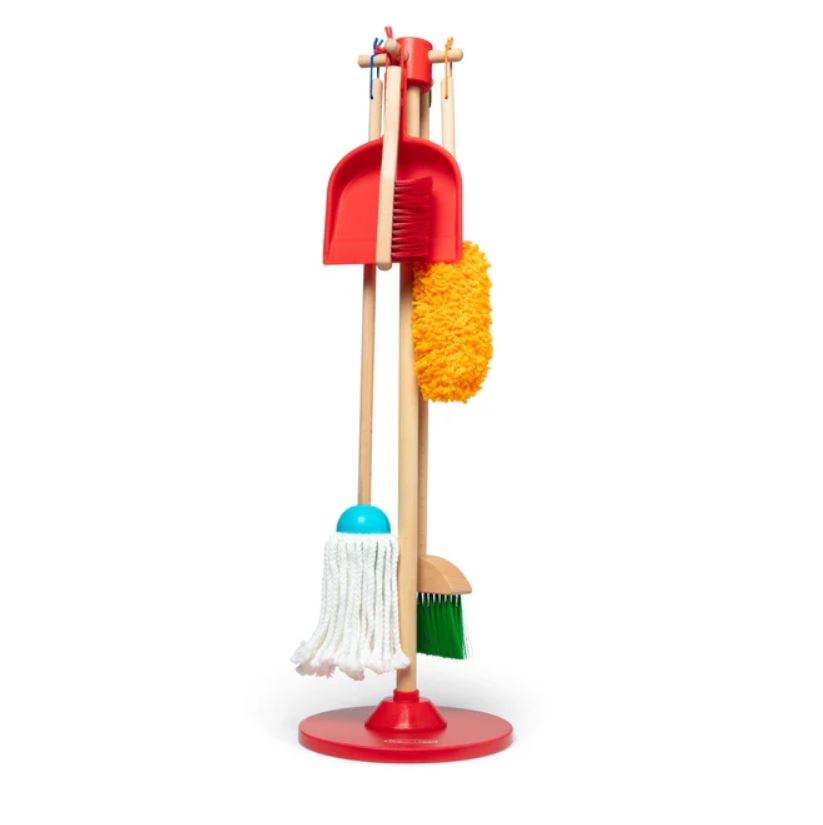 -6-piece cleaning set for hours of pretend play housekeeping -Includes broom, mop, duster, dustpan, brush, and storage stand -All pieces durably made and sized for kids -Dust pan snaps onto all handles -Sturdy wooden construction