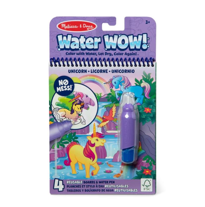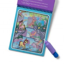 -Use the refillable chunky water pen to color with water and reveal vibrant colors on 4 unicorn-themed spiral-bound coloring boards